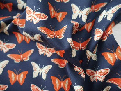 An organic cotton by Cloud 9 fabrics featuring beautiful butterflies in rust and mint on an indigo ground..